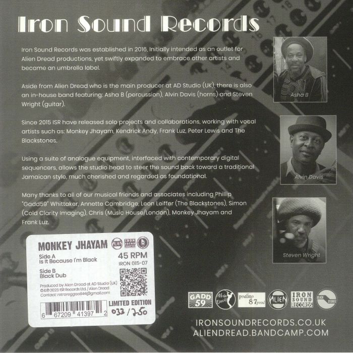 Monkey Jhayam / Alien Dread Is It Because I’m Black Iron Sound Formato: hand-numbered 7″ in die-cut sleeve limited to 250 copies
